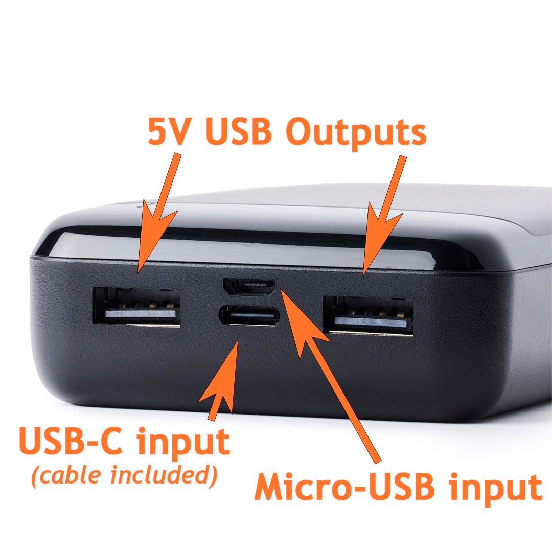 Rechargeable power bank (3+ or 6+ hour capacity) with USB-C cable